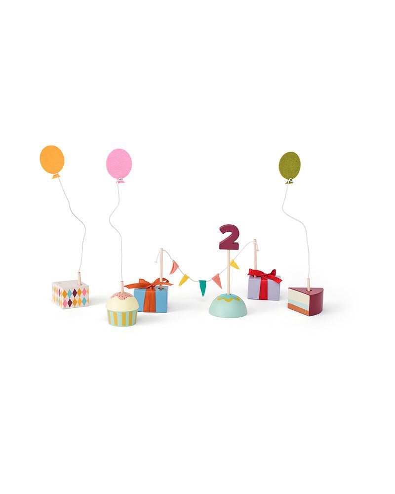 De set bestaat uit vijf feestelijke decoraties in de vorm van cadeautjes, taarten en cupcakes. In elk onderdeel kan een houten cijfer worden geplaatst om de leeftijd van de jarige te markeren. De meegeleverde cijfers 0 t/m 9, plus een extra 1, maken het mogelijk de set jaar na jaar opnieuw te gebruiken.
