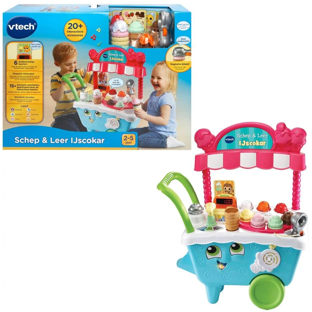 VTech Schep en Leer IJscokar. Gebruik je fantasie en maak de lekkerste ijscreaties, mmm verrukkelijk! Heerlijke ijsjes voor groot en klein, wat mag het zijn? De interactieve ijslepel herkent op magische wijze de verschillende smaken en toppings. Plaats één van de zes dubbelzijdige kaarten in de kassa en maak de bestellingen voor de dieren klaar. Fantasie komt tot leven met de interactieve ijslepel die de bolletjes ijs en toppings herkent! Of speel grappige spelletjes en leer tellen, kleuren, smaakjes en nog meer! Met 4 vrolijke melodietjes en 6 gezongen liedjes. De Schep en Leer IJscokar beschikt over regelbaar volume en een aan/uit schakelaar. De IJscokar schakelt automatisch uit. Wordt inclusief 3 AA-batterijen geleverd in try-me verpakking. Geschikt voor kinderen van 2 tot 5 jaar.