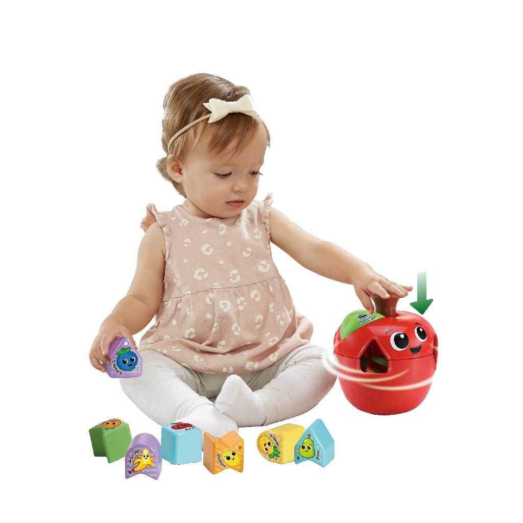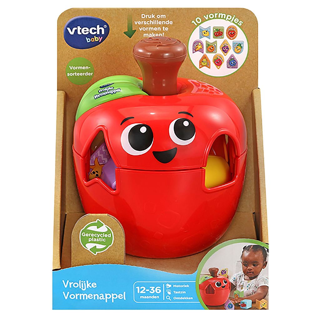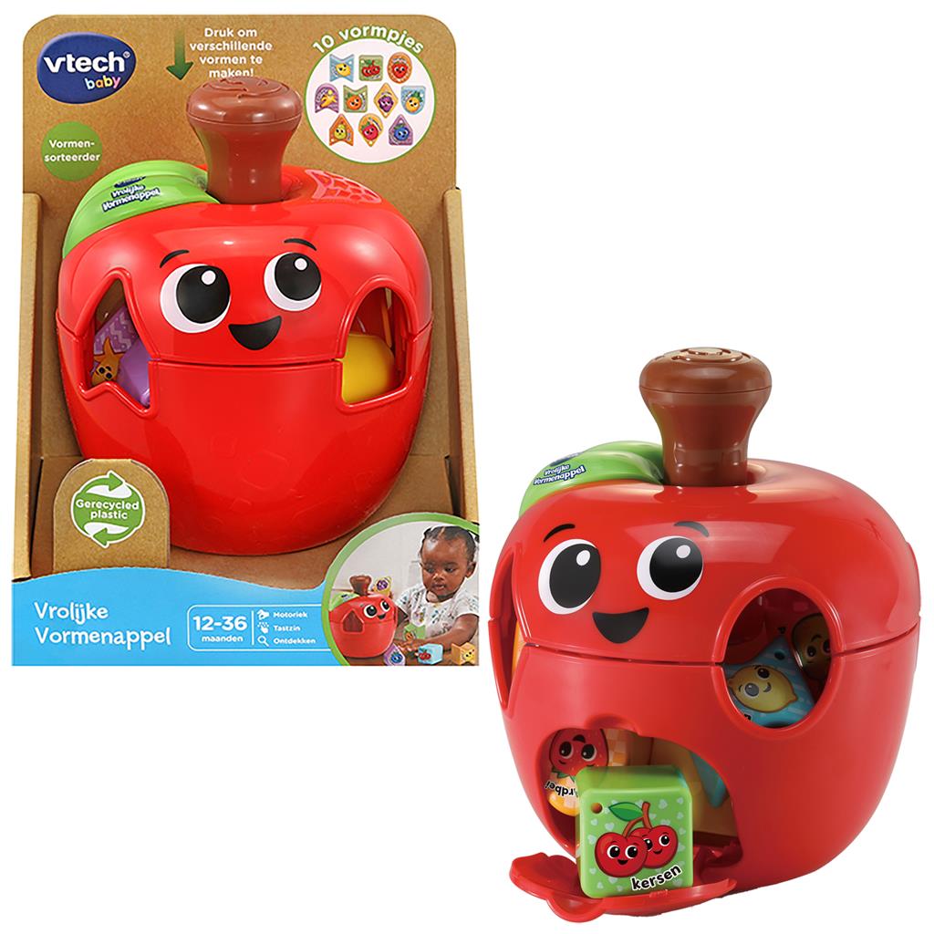 De Vrolijke Vormenappel geeft een nieuwe draai aan de klassieke vormensorteerder. Druk op de appel om 10 bekende én nieuwe vormen te maken waar de vormpjes in passen. Met deze leuke appel ontdekt het kleintje nieuwe vormen en fruitsoorten én ontwikkelt het de fijne motoriek en de tastzin. Druk en draai, het is tijd om te spelen!