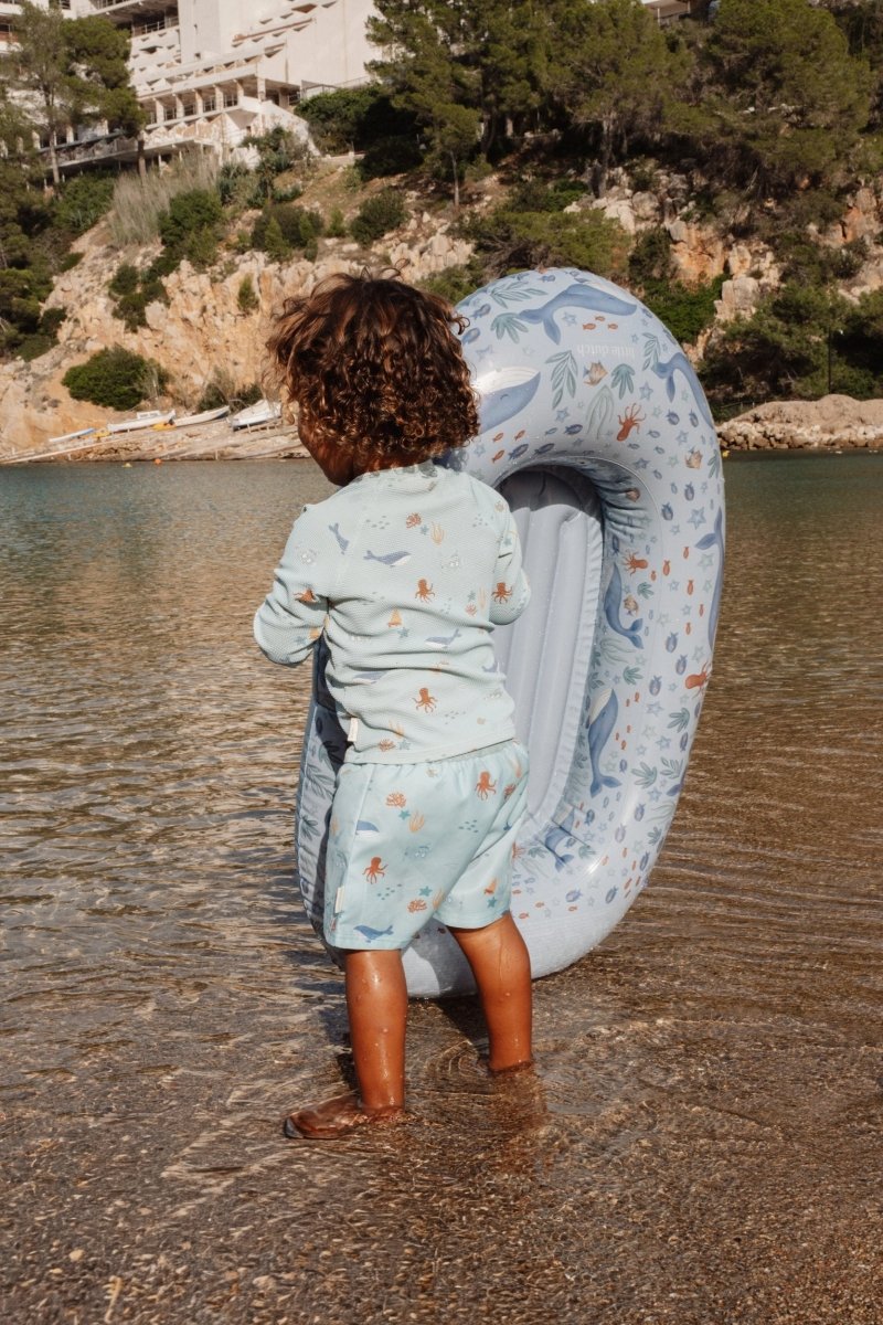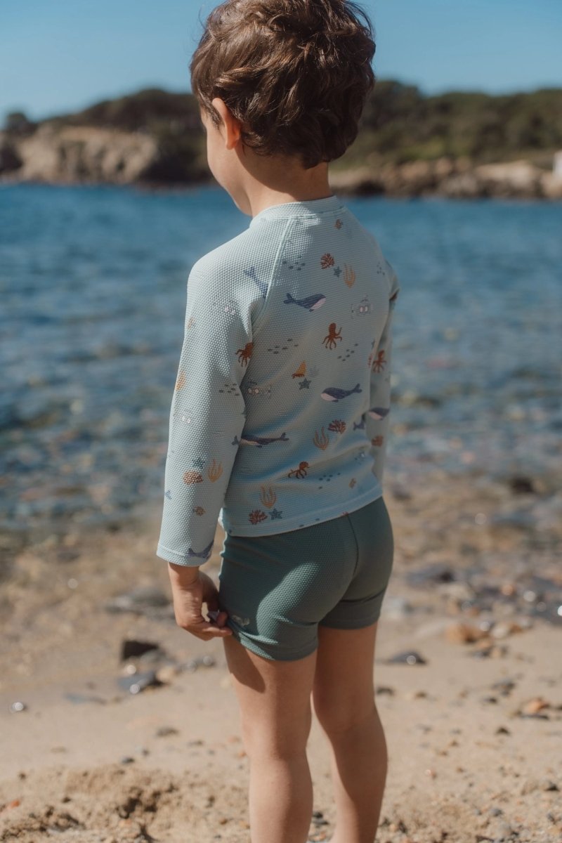 Dit groene zwemshirt met lange mouwen uit de Ocean Friends-collectie is perfect voor kleine waterratjes die graag spelen in de zon. De vrolijke onderwaterprint zorgt voor een speelse uitstraling, terwijl de stof helpt beschermen tegen de zon tijdens zomerse avonturen. Vergeet niet om je kleintje altijd goed in te smeren met zonnebrandcrème voor optimale bescherming.
