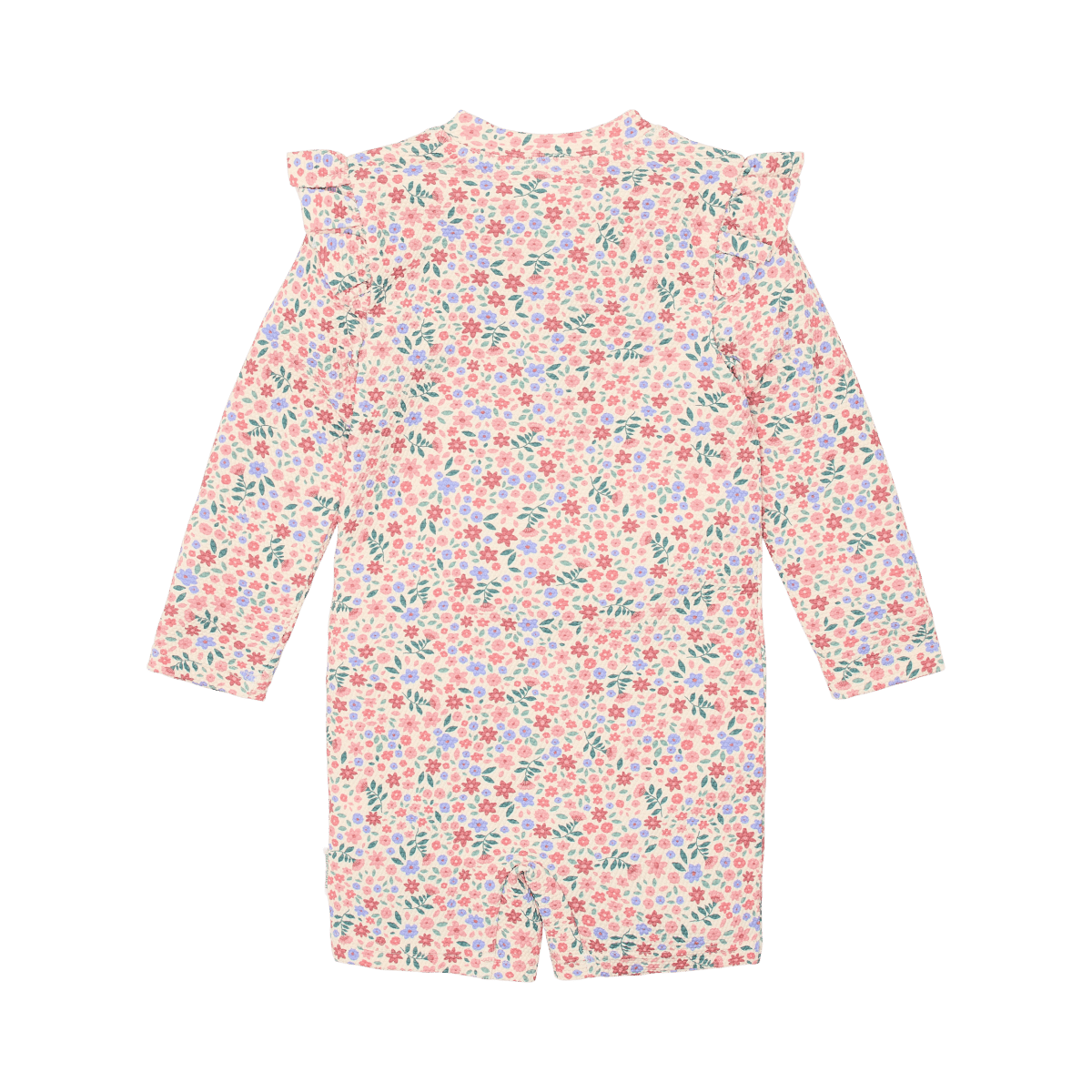 Laat je kleintje stralen tijdens zonnige dagen met het zwempak Dreamy Flowerfield. Dit charmante zwempak met lange mouwen heeft een lichte ondergrond met subtiele bloemetjes, wat zorgt voor een frisse en zachte uitstraling. Perfect voor een dagje strand, zwembad of vakantie.